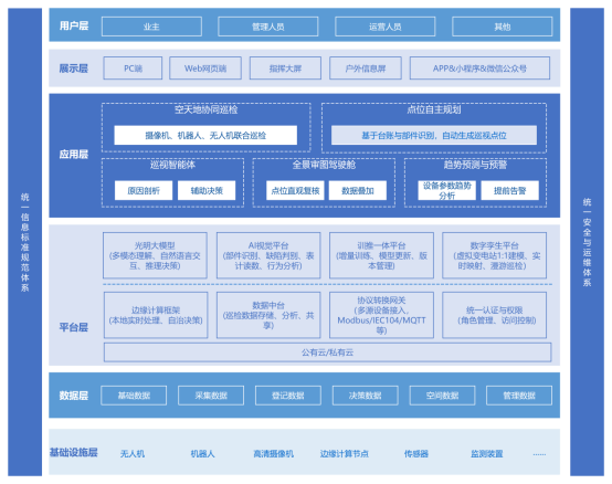 4. 轨道机器人智能巡检:自主往返巡检,搭载可见光/红外云台及多气体传感器,支持异常点复检、红外测温、环境监测,配备接触式感应充电,续航10km以上,多机协作冗余备份。